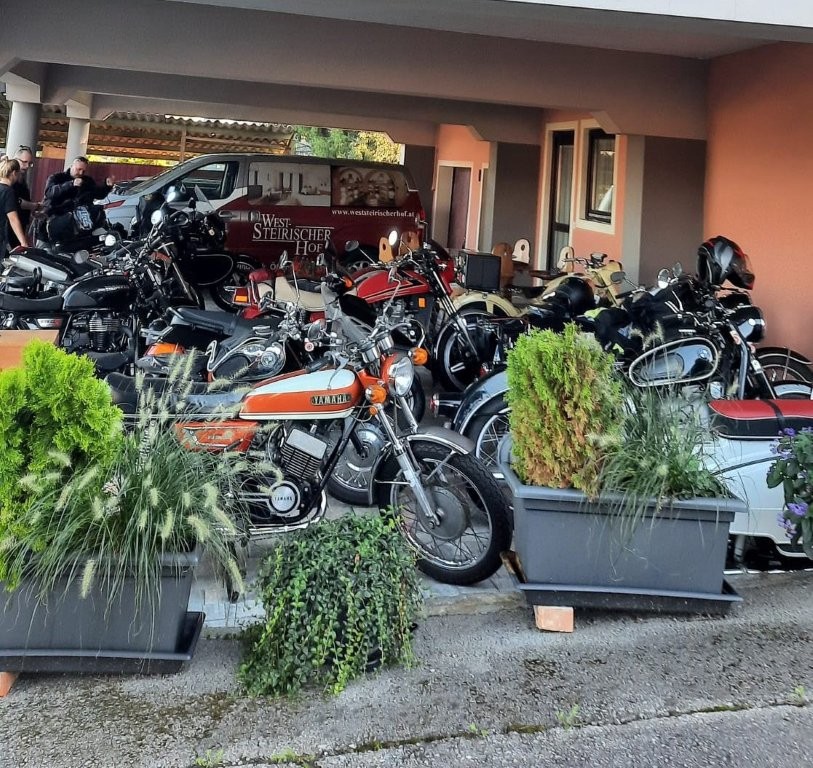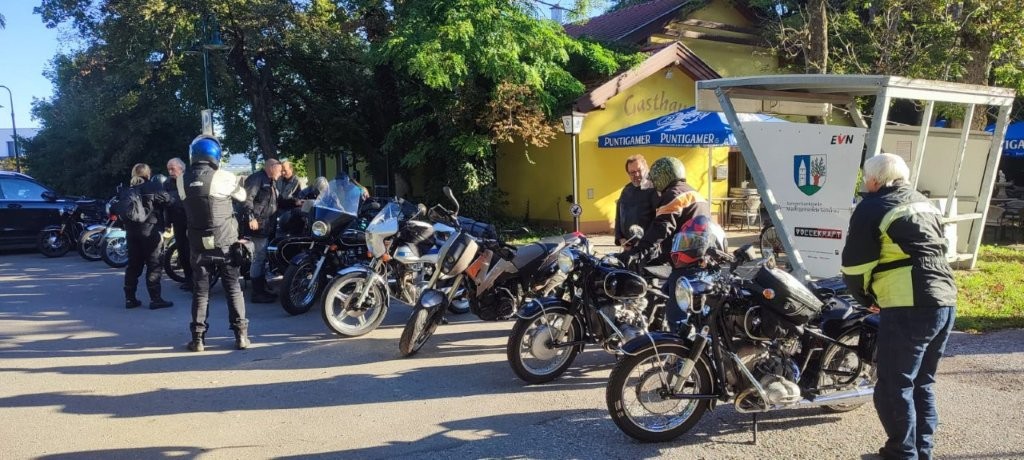 Vom Tankstopp ging es dann über Haslau bei Birkfeld, Heilbrunn und Brandlucken, nahezu punktgenau im Zeitplan, zur Mittagsrast beim Gasthof „Karl- Wirt” in St.Kathrein am Offenegg.