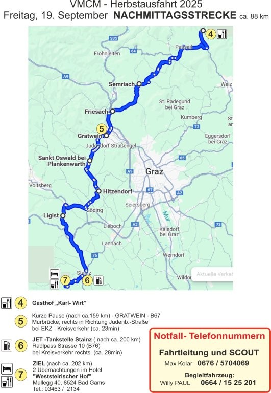 Abfahrt über In der Waiz, Passail, Semriach, Richtung Friesach, mit einer kurzen Pause bei Gratwein.